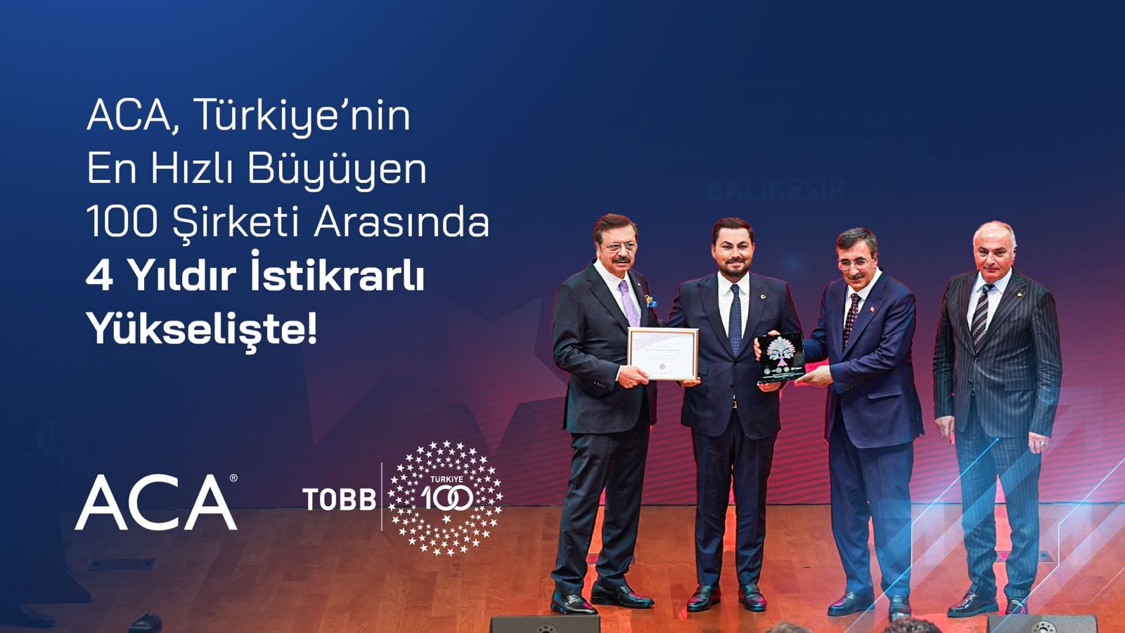 ACA Teknik İnşaat, TOBB tarafından düzenlenen “Türkiye 100” yarışmasında üst üste ikinci kez Türkiye'nin en hızlı büyüyen 100 şirketi arasında yer aldı. Böylece iki dönemi kapsayan dört yıllık istikrarlı büyümesini taçlandıran şirket, ödülünü 22 Eylül’de Ankara'da yapılan törende Cumhurbaşkanı Yardımcısı Sayın Cevdet Yılmaz ve TOBB Başkanı Sayın M. Rifat Hisarcıklıoğlu'nun elinden aldı. “Bu başarı yüksek mühendislik ve teknolojiye olan inancımızın yansıması”ACA Kurucusu ve Yönetim Kurulu Başkanı Ahmet Acaroğulları, "TOBB Türkiye 100 listesinde üst üste ikinci kez yer almak ve Balıkesir'den de bu gurura ortak olmak bizim için çok kıymetli. Bu başarı yüksek mühendislik, veri merkezli yönetim ve teknolojiye olan inancımızın yansıması. Ödülümüzü bize güvenen müşterilerimize, iş ortaklarımıza ve bu başarıya imza atan tüm ACA Ailesi adına kabul ediyoruz” dedi.